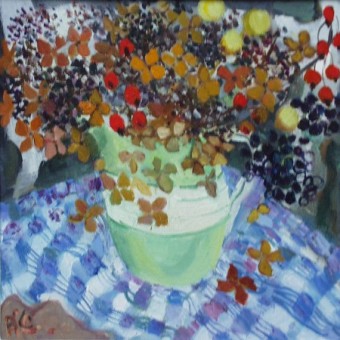 green jug flowers checked cloth