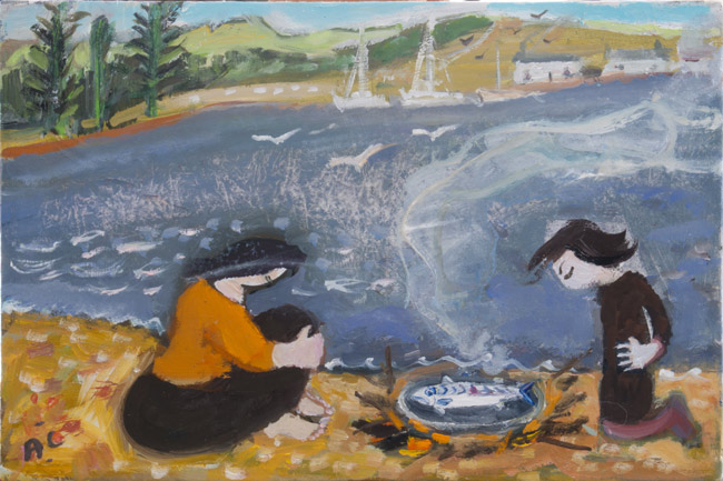 Oil on cigar box, 5½" × 8"